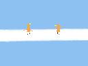 消える飛行機雲、鳥たちは見送った。見送ったが、好奇心には勝てず、遊びに行った。飛行機雲へ向かって飛びたった彼らの運命や如何に!! 乞うご期待!! というわけで、雲の上に昇ったはいいが、片方が飛び跳ねすぎて雲に穴をあけてしまい、落っこちた。それを追っかけて行き、池にダイブ。溺れたかと思いきや、亀に助けられて生還。無事に飛び立って行き・・・・戻ってきた飛行機に撥ねられフレームアウト。完。
